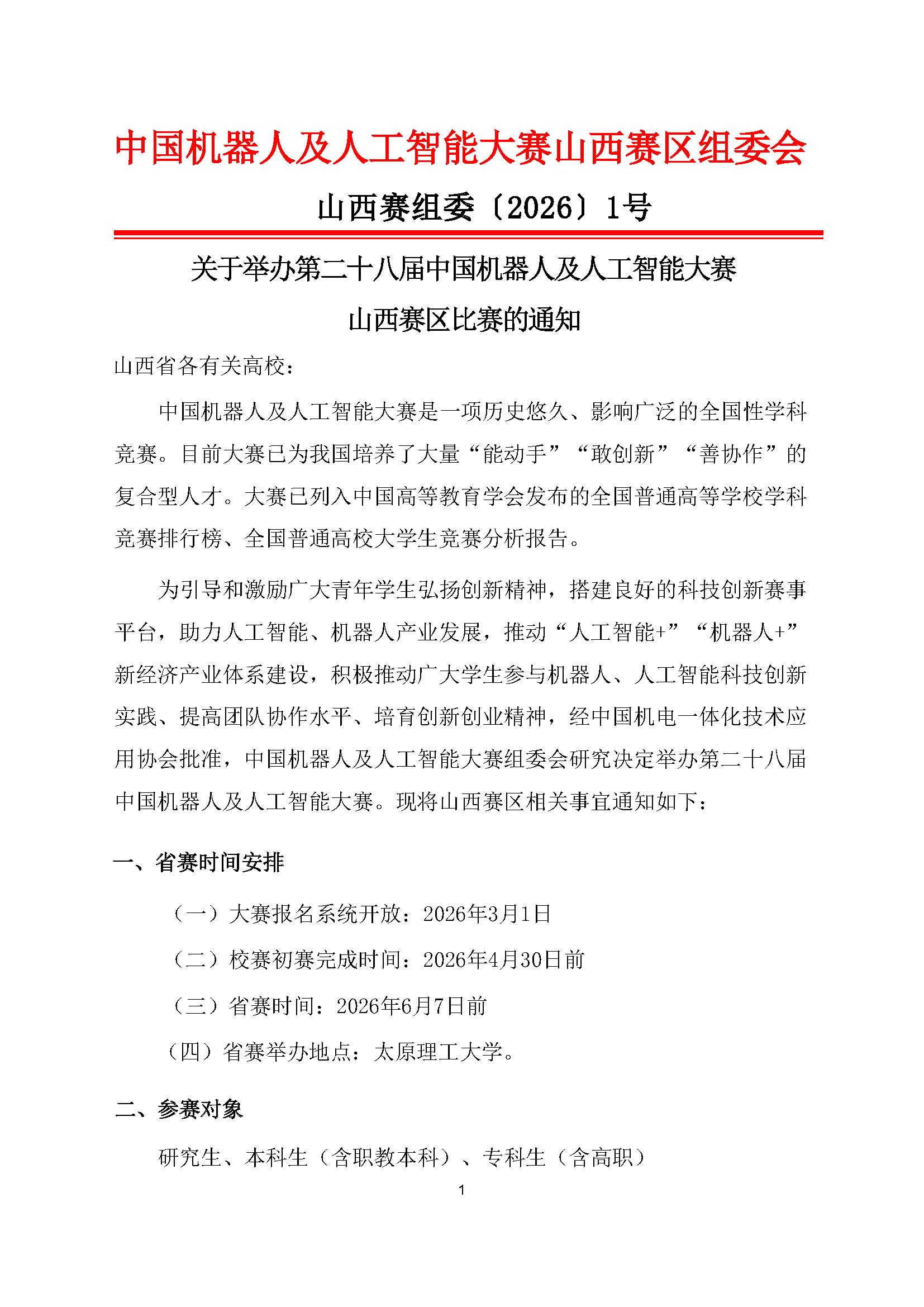 关于举办第二十八届中国机器人及人工智能大赛山西赛区比赛的通知